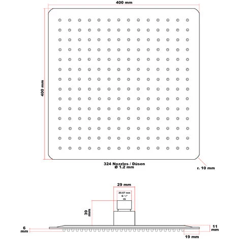 | Dimensiones | Dimensiones (incl. conexión): 400 x 400 x 50 mm Altura: 0,9 mm Número de boquilla: 256 |