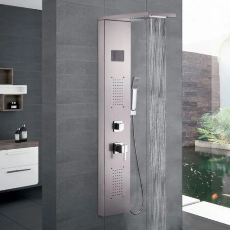 Fabricada en acero inoxidable cepillado de gran calidad, esta columna de ducha multifunción de grosor reducido permite aprovechar aún más el espacio dentro de la ducha. Se compone de una estructura vertical con dos chorros de agua que se pueden utilizar para relajarse y masajear la espalda, una alcachofa que crea un efecto lluvia y cascada en la parte superior y una alcachofa de mano con manguera flexible para una ducha rápida o para limpiar la columna de ducha después del baño. También cuenta con una pantalla integrada en el panel que le permite controlar la temperatura del agua. Las funciones son fáciles de utilizar, el desviador de 4 vías permite elegir entre los chorros de hidromasaje, el tipo de alcachofa de ducha o la utilización de ambas para disfrutar totalmente de cada ducha. La grifería garantiza la máxima seguridad y permite regular tanto la temperatura como la intensidad de los distintos chorros con facilidad. Los dispensadores disponen de un sistema anticalcáreo para mantener siempre limpia su columna de ducha de hidromasaje y la instalación se realiza a ras de la pared y no requiere de la realización de reformas especiales, simplemente se debe conectar a las tomas de agua.