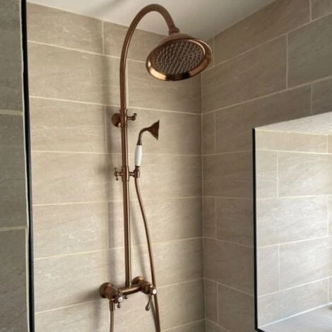 ¿Busca una columna de ducha de estilo retro? El «Leeds» es el indicado, de color cobre y altura regulable, funciona con todo tipo de calderas.