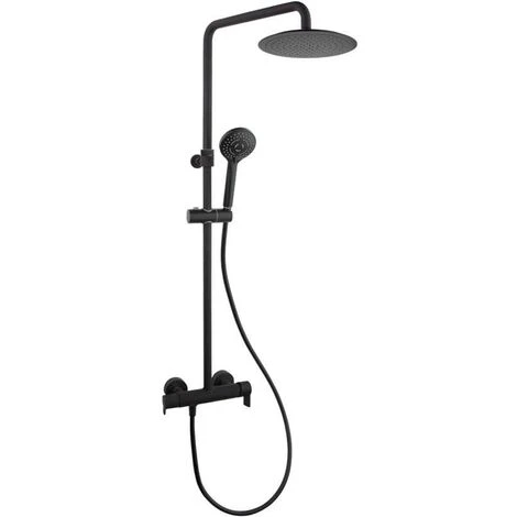 Columna de ducha telescópica de la colección de baño BLAUTHERM. La columna está compuesta por grifo monomando, ducha de mano, y flexo, rociador Ø240mm y columna de ducha. Todo color negro mate, el color de moda para el baño 2022. Última tecnología con sistemas como cooltouch antiquemaduras, limitador de temperatura Termostop y anticorrosión patentado. Descubre la colección de grifería negra.