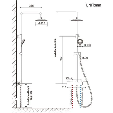 - Nuestra columna de ducha con mezclador termostático 38°C. Altura ajustable de 80cm a 110cm, adecuada para clientes de diferentes tamaños.