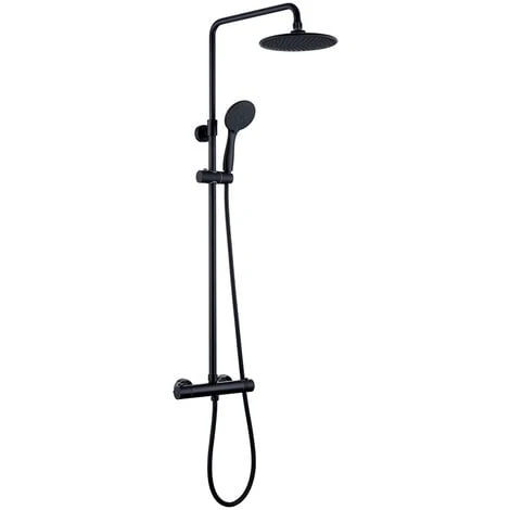 Columna de ducha termostática de color negro mate diseño redondo. Regulable en altura de 83 a 120 cm. ? Diseño y confort, aporta diseño y bienestar a tu vida con nuestra columna de ducha termostática regulable en altura de 83 a 120 cm, la temperatura está calibrada a 38 grados, a partir de los cuales puedes subirla o bajarla hasta encontrar tu punto exacto de confort, ideal para esos momentos en los que necesitas relajarte con hidromasaje, por ejemplo, cuando llegas a casa al final de la jornada laboral ? Materiales de alta calidad, todos los componentes del sistema de ducha con termostato cuentan con elementos metálicos de gran calidad y acabados en latón, fáciles de limpiar, que aportan ese toque de diseño elegante y moderno que buscas para tu hogar, destacan el tubo, fabricado en latón , así como el rociador, de acero inoxidable y salida con sistema antical, el flexo es de acero inoxidable , tuercas de latón y terminaciones en negro mate. ? Sencillo manejo y ergonomía, el sistema de regulación en altura y orientación es el adecuado para distintos tipos de usuarios, ideal y adaptable para toda la familia, el tubo es regulable en altura desde 83 hasta 120 cm., mientras que el soporte de latón es regulable. ? Seguridad ante todo, en el uso diario del grifo termostático con selector integrado, tu seguridad y el bienestar de tu familia son lo principal, por lo que incorporamos un botón de seguridad para evitar quemaduras, escaldados u otros incidentes relacionados con la temperatura, además, el interior del flexo es antitóxico con gran resistencia a los cambios de temperatura Ducha termostática, ya que el tubo es regulable en altura desde 83 hasta 120 cm, adaptable a cualquier tipo de usuario, mientras que el soporte, además, es regulable en orientación, para nosotros tu seguridad de los tuyos es lo primero, por lo que en el grifo incorporamos un botón para evitar quemaduras o escaldaduras, el sistema de ducha termostática está configurado a 38 grados, de acuerdo a criterios ergonómicos, por lo que es importante que ajustes previamente la temperatura más adecuada para ti, con la total confianza de que se mantendrá estable DURte todo el proceso, además, el flexo de acero inoxidable tiene un interior realizado en epdm atóxico, con excelente resistencia al vapor, a los agentes oxidantes y a ácidos diluidos, y que mejora la resistencia a los cambios de temperatura, materiales de primera calidad, acabados en latón, ten la certeza de que nuestra columna de ducha con termostato, con su diseño extraplano y cuadrado, está fabricada con materiales de primera calidad, ponemos especial cuidado en el diseño, aunando un aspecto moderno y atractivo con un manejo sencillo y sin complicaciones, el conjunto de ducha y grifo termostáticos incluye el tubo cuadrado telescópico de latón color negro mate y el flexo de 150 cm en acero inoxidable cromado en brillo, el rociador superior es de acero inoxidable 304 e incluye salida con un sistema antical, tanto el soporte deslizante de pared como el soporte de ducha son de latón, el resto de componentes, ducha hidromasaje, grifo termostático, rociador, etc, también combinan estos materiales de gran calidad. Características destacables ? Sistema de columna redonda extraplana termostática que dará un diseño más exclusivo a su cuarto de baño. Es muy fácil de limpiar y mantener en perfecto estado. ? Duchón rociador de 23 cm, con caida de agua efecto lluvia para una relajante ducha. ? Ducha de mano que le facilitará la limpieza y evitará la calcificación rápida en zonas con aguas más calcáreas. ? Columna con tubo redondo muy resistente fabricado en latón. ? Flexo de ducha de acero inoxidable con acabado en negro mate, con gran resistencia ante torceruras o nudos y tiene una protección contra las quemaduras por el paso del agua caliente. El pack incluye: ? Grifo termostático cuadrado fabricado en latón macizo ? Flexo de acero inoxidable cromado ? Maneral ABS redondo con posiciones con sistema antical ? Tubo cuadrado extraplano extensible de 83cm hasta 120cm de latón ? Rociador / Duchón superior redondo ? Soporte deslizante cuadrado para mango de ducha fabricado en latón ? Embellecedores y excéntricas para el grifo ? Soportes de pared para sujeción del tubo Sistema de columna de ducha extensible: ? Sistema: Termostático ? Peso apróximado: 3 kg ? Material fabricación: Latón, ABS y acero inoxidable ? Acabado / color: negro mate ? Rango de temperatura: 0 a 85 ° C ? Cartucho cerámico: si