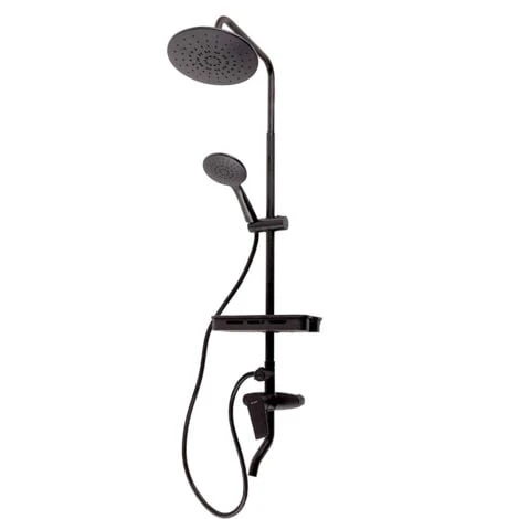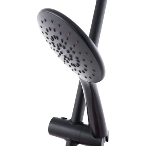 Conjunto de ducha fabricado en latón/zinc compuesto por alcachofa,cabeza de ducha, flexo, barra y grifo monomando, con acabado en negro. Este conjunto de ducha permite la instalación regulable (adaptable a orificios de perforación ya existentes) a la pared.