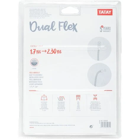 Manguera de ducha Dual Flex de TATAY ofrece lo ultimo de las duchas modernas con la resistencia del material con el que está construido, de Latón. El acero inoxidable es del grado 301, mucho más resistente a la presión que ejerce el agua que el grado 304. Diseñado por TATAY España