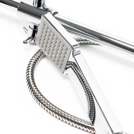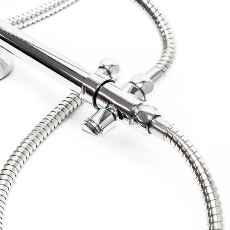 | Aplicación / Información / Equipamiento | Cabezal lluvia de ducha con chorro de agua suave Ducha de mano con chorro de agua más fuerte Fácil sustitución entre ducha de mano y rociador Material: barra de ducha de acero inoxidable, ducha de mano cromada, ducha superior cromada |