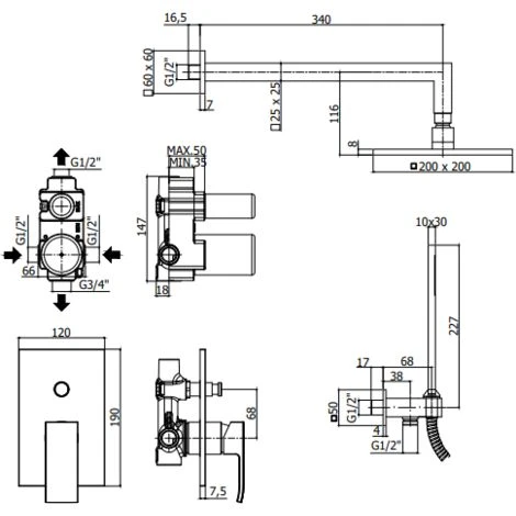 Composición para la ducha completa con todo lo necesario para una instalación rápida y moderna, este kit de ducha minimalista de línea cuadrada está fabricado en Italia con materiales de alta calidad, el rociador efecto lluvia con dimensiones 20 x 20 cm y conexión estándar 1/2 G.