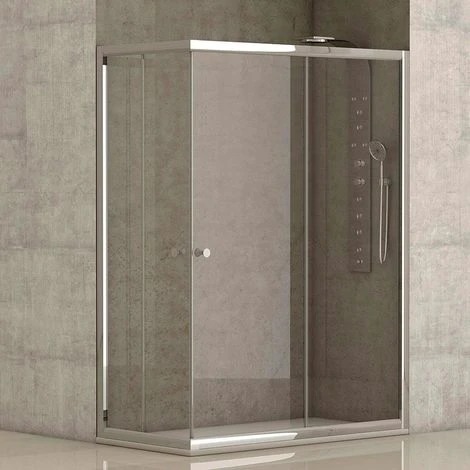 Mampara modelo Catania. Mampara de ducha compuesta por 2 Hojas fijas mas 2 hojas correderas. Entrada a la mampara por el vertice.