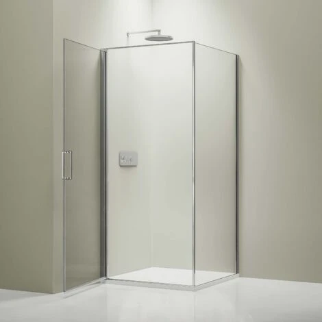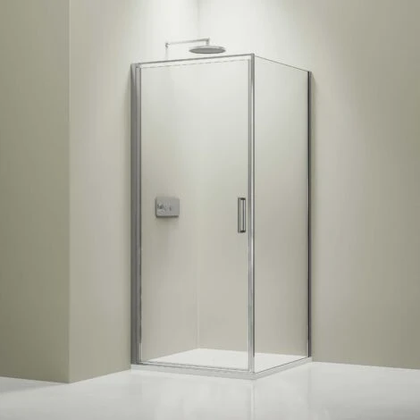 Ducha angular BERNSTEIN de calidad superior con una mampara fija y una puerta pivotante con mecanismo de subida y bajada.