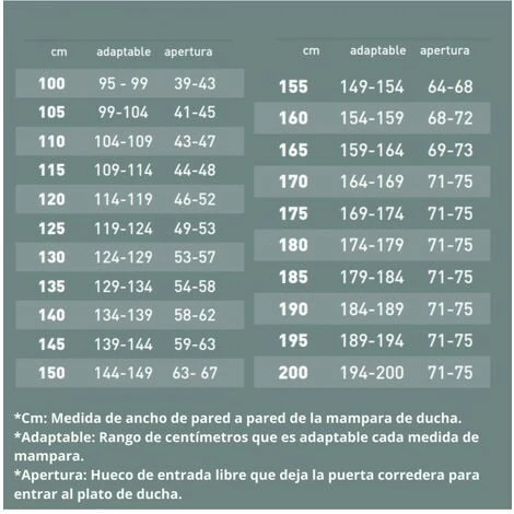 – Disponible en gran variedad de medidas (en las im�genes podr� ver el rango de medidas adaptable de cada media y el ancho de paso al plato ducha).