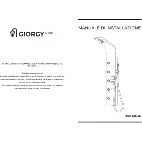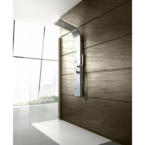 Panel de ducha en acero inoxidable cepillado con chorros de masaje frontales ajustables e incrustados en latón. La solución ideal para los amantes de la ducha totalmente relajante. La forma cuadrada y los detalles en acero cepillado hacen de este panel un producto muy elegante, caracterizado por un diseño minimalista y una relación calidad / precio óptima. El panel incluye el mezclador mecánico con cuatro funciones, que son: el cabezal de la ducha, la cascada cervical, la ducha de mano y los chorros de masaje frontales hechos de latón y ajustables. Se recomienda una instalación de 85-100 cm, altura relacionada a las conexiones de frío y calor, que tienen una distancia de 8-15 cm.