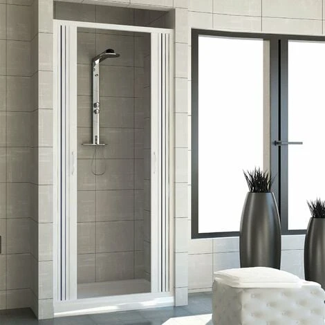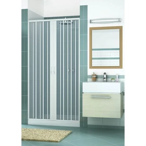 - Mampara de ducha extensible de PVC (cloruro de polivinilo: material reciclable, duradero y robusto) con apertura Central y hoja individual plegable