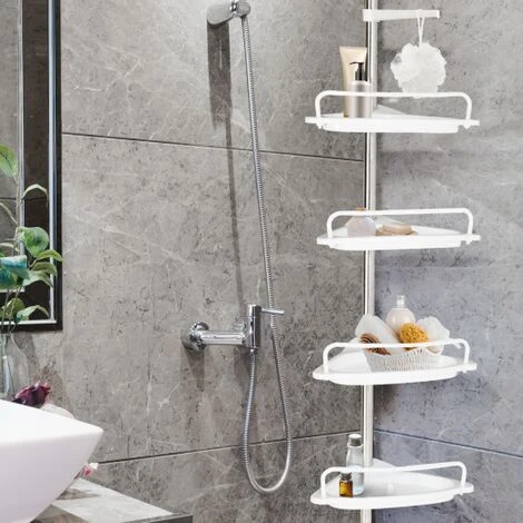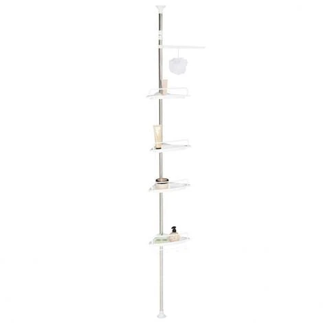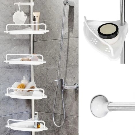 Gracias a un ingenioso sistema de muelles, este estante esquinero telescópico para cuarto de baño se instala en un abrir y cerrar de ojos sin clavos ni tornillos en su cabina de ducha. Esta rinconera de baño telescópica ID Market se adapta a las dimensiones de su espacio de ducha o al borde de su bañera. Máximo ahorro de espacio garantizado y los productos de higiene siempre al alcance de la mano.¡Se acabaron los botes de champú y gel de ducha tirados en la ducha! Perfecta con sus 4 estantes de almacenamiento ajustables, esta estantería está equipada con ganchos y un colgador para colgar sus flores de ducha y/o franelas. Los estantes tienen agujeros para drenar el agua.Fácil de instalar, resistente y económica, ¡instale esta estantería telescópica de acero inoxidable con baldas de polipropileno blanco en cualquier cuarto de baño!Cada miembro de la familia puede tener su propio espacio, o prefiera organizarlos por tipo de producto: un estante para champú, gel de ducha, productos para el cuidado de la piel, etc. Optimice el almacenamiento de sus botellas y accesorios sin sacrificar el espacio de su cuarto de baño.Gracias a la repisa de ducha, fije la superficie del plato de ducha. Así evitará que un bote de gel de ducha caiga al suelo, o incluso que usted mismo se resbale con un bote. Mantenga todos sus productos de higiene al alcance de la mano, sin tener que agacharse y, posiblemente, chocar con las paredes de su ducha.Montaje rápido sin herramientasDimensiones totales: Altura: de 105 cm a 310 cm Dimensiones: Ancho 23 cm x Largo 23 cmColores: Gris/cromo y almacenamiento en blancoMateriales: Acero inoxidable y plástico (polipropileno)4 ganchos para accesorios