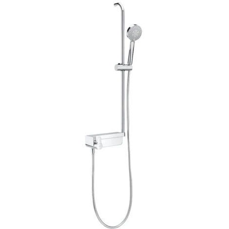 DECK – Columna monomando para ducha con repisa. Incluye ducha de mano de ø 100 mm de 3 funciones, flexible de PVC satinado de 1,75 m y soporte articulado regulable en altura