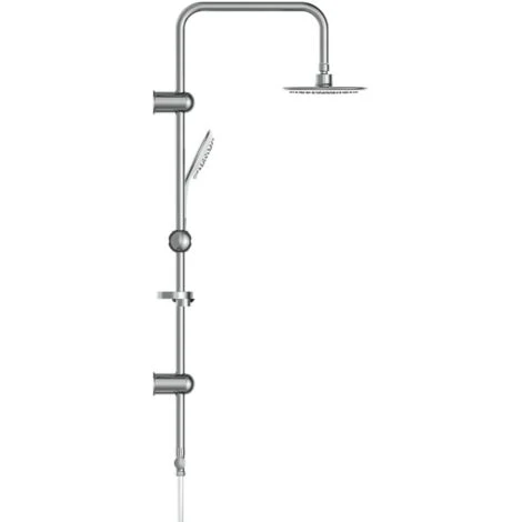 Este juego de ducha está fabricado en material metálico y tiene un acabado cromado. Puede pasar de ducha de mano a ducha alta a través del desviador. La teleducha tiene una manguera de 1,5 metros y es regulable en altura, lo que la hace perfecta para satisfacer las necesidades de su ducha.