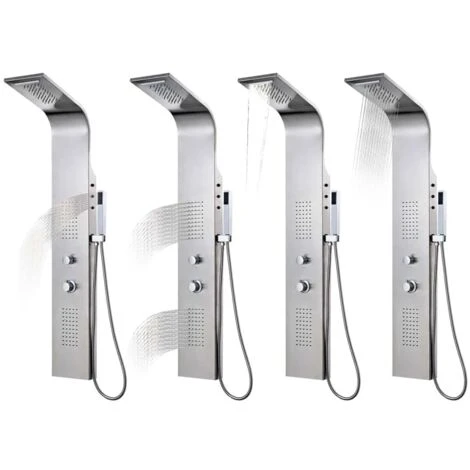 La ducha está hecha de acero inoxidable duradero con un acabado cepillado y un diseño hermoso curvo. Tiene cuatro modalidades: lluvia, cascada, masaje y ducha manual, que se pueden seleccionar fácilmente con la perilla. Las luces LED se pueden encender y apagar según su estado de ánimo. La temperatura del agua se puede ajustar con la perilla del termostato.