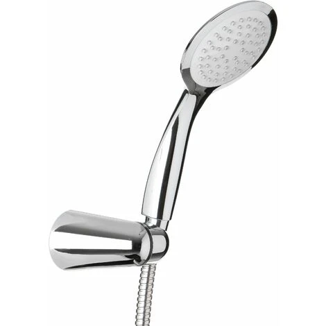 Kit ducha soporte, modelo Alcala, compuesto de una ducha funcional, de lineas planas, de 1 funcion, en ABS cromado y con el disco blanco, diametro 10 cm. Sistema antical, easy clean y de ahorro de agua, soporte multiposicion cromada y flexo metal inox de doble engatillado de 1,5 m.