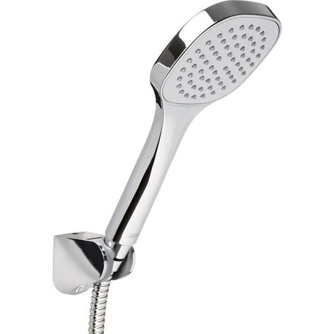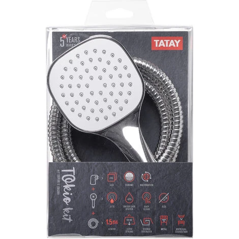 Kit ducha modelo Tokio, compuesto de ducha de 1 funcion, diametro 10 cm, de moderno diseño,de formas cuadradas, menbranas anti-cal y sistema de ahorro de agua, soporte multiposicion cromado y flexo metal 1,5m de doble engatillado.