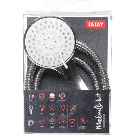 Kit ducha modelo Malmö, compuesto de ducha de 3 funciones, diametro 10 cm, de moderno diseño, menbranas anti-cal y sistema de ahorro de agua, soporte multiposicion cromado y flexo metal 1,5m de doble engatillado.