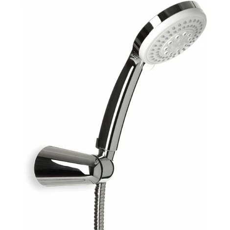 Kit ducha soporte cromado, modelo Calma, compuesto de ducha de 5 funciones, diametro 10,5 cm, con disco blanco y base cromada, facil selector de funciones. Sistema antical y de ahorro de agua. Soporte inox multiposicion y flexo 1,5 doble engatillado.