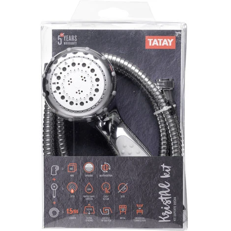 Kit ducha modelo Kristal, compuesto de ducha de 8 funciones, que se seleccionan girando la corona, diametro 8 cm, con sistema de ahorro de agua, caudal de 10L/min a 3 bars de presion. Soporte cromado multiposicion y flexo metal inox de 1,5 m.
