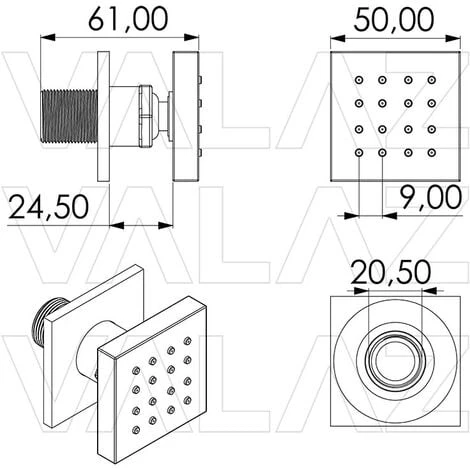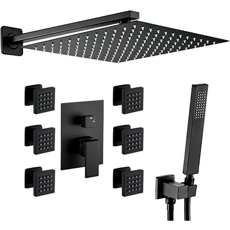 Materiales: Rociador de acero inoxidable, monomando de latón, alcachofa de mano de PVC ,flexo de acero inoxidable y 6 jets empotrados.