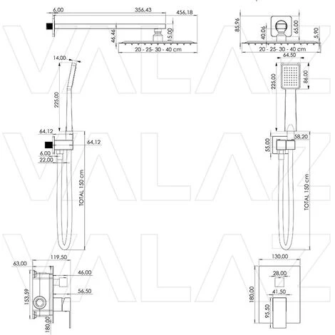 Incluye: Rociador disponible en tamaño 20×20, 25×25 ,30×30 ,40×40 con soporte a pared, monomando de 2 vías (rociador efecto lluvia y alcachofa de mano) flexo de 150cm y alcachofa de mano con soporte. Materiales: Rociador de acero inoxidable, monomando de latón, alcachofa de mano de PVC y flexo de acero inoxidable. Acabado: negro mate Funciones: Esta ducha consta de dos funciones el efecto lluvia del rociador y la alcachofa de mano.
