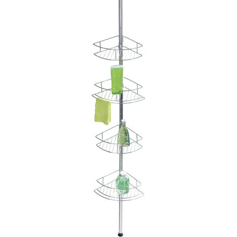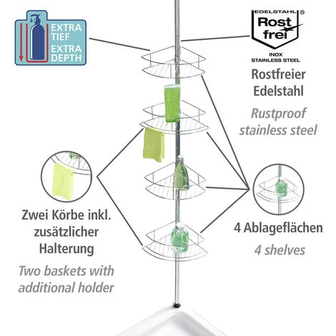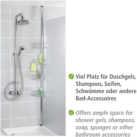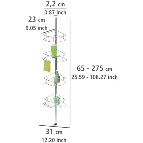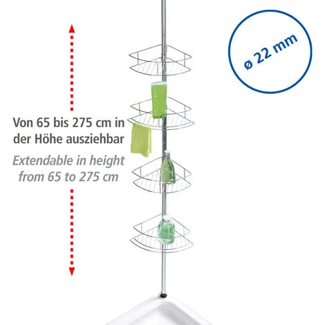 La repisa rinconera telescópica de alta calidad Dolcedo, fabricada con acero fino inoxidable, es de uso universal en cabinas de dicha, esquinas de bañeras y habitaciones. La práctica repisa esquinera de acero inoxidable, ofrece con cuatro cestas de alambre numerosas posibilidades de colocación para champú, gel de ducha, jabón, esponjas y otros utensilios de baño. Dos cestas tienen un soporte adicional para enganchar bayetas, etc. El montaje es rápido y sencillo, sin taladros, ya que la estantería telescópica se puede fijar fácilmente entre el suelo y el techo. La altura es variable, ya que la barra telescópica se puede regular entre 56 y 275 cm. La barra telescópica tiene una calidad sólida y un diámetro de tubo de 22 mm. La garantía del fabricante es de 3 años. Para este producto usted dispone de 3 años de garantía a partir de la fecha de compra. La garantía cubre todos los defectos de material y fabricación, que perturben el funcionamiento. A excepción de los daños que sean causados por el uso indebido o el desgaste normal. Esta garantía no limitará sus derechos legales de garantía. En caso de hacer uso de la garantía, envíe gratuitamente el producto junto con el recibo de pago correspondiente y empaquetado de forma segura para el transporte a la siguiente dirección: Wenko-Wenselaar GmbH & Co. KG · Abteilung „Retouren“ Im Hülsenfeld 10 · 40721 Hilden, Alemania [email protected] · www.wenko.deancho 31 cm x altur 65-275 cm x profu 23 cm, Ablagen haben eine Höhe von 7 cm